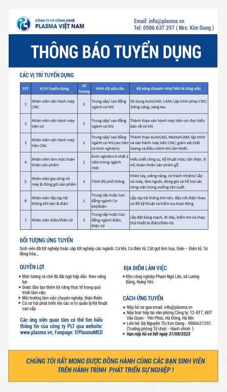 Gửi CV về email: info@plasma.vn
