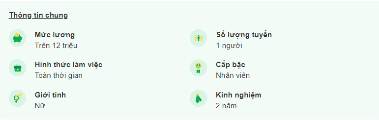 – Thu nhập/tháng: Lương cứng : 12 triệu đồng + thưởng hiệu quả công việc